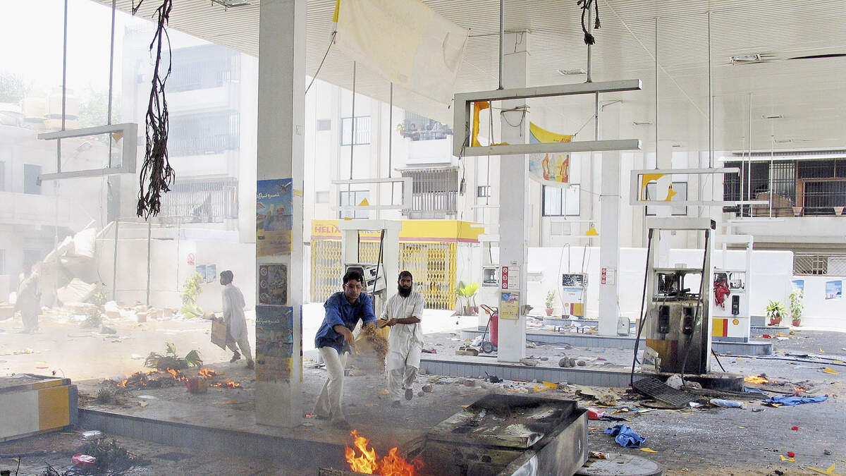 Amazingly, he manages to get in the burning car from the passenger side, cranks the engine, and drives the burning car away before being seen running back to the pump and grabbing a fire extinguisher to put out the rest of the flames.
